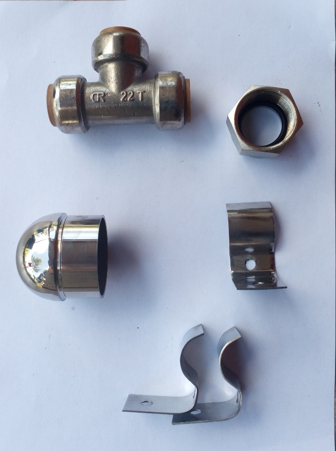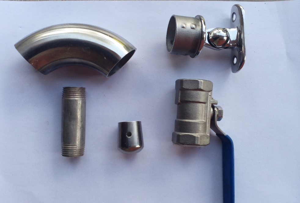 Stainless steel tubes type tee, sockets, welded butterfly valves, non-return valves, ball valves, 90 degree elbows, pipe clamps, barrel nipples, tees.