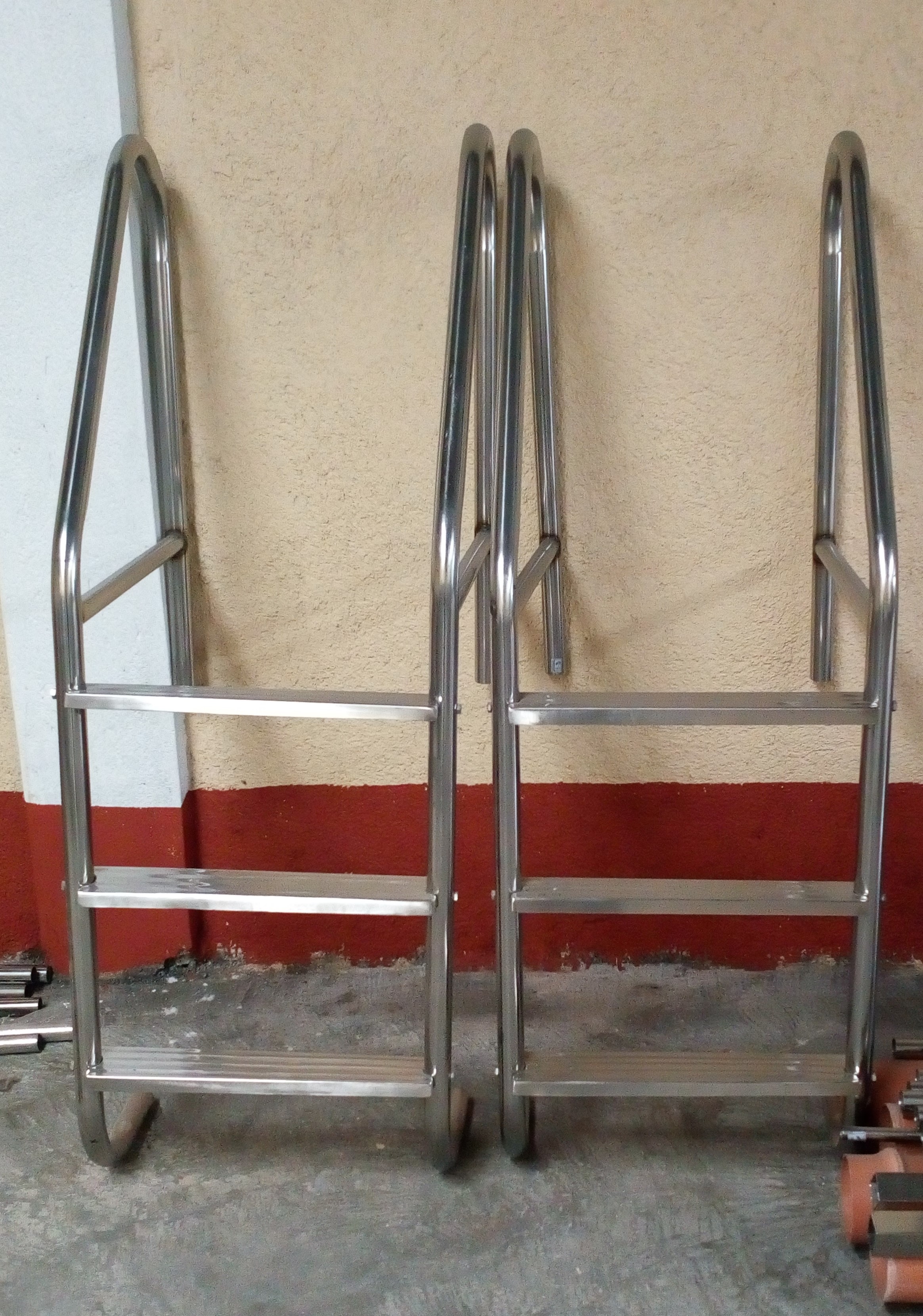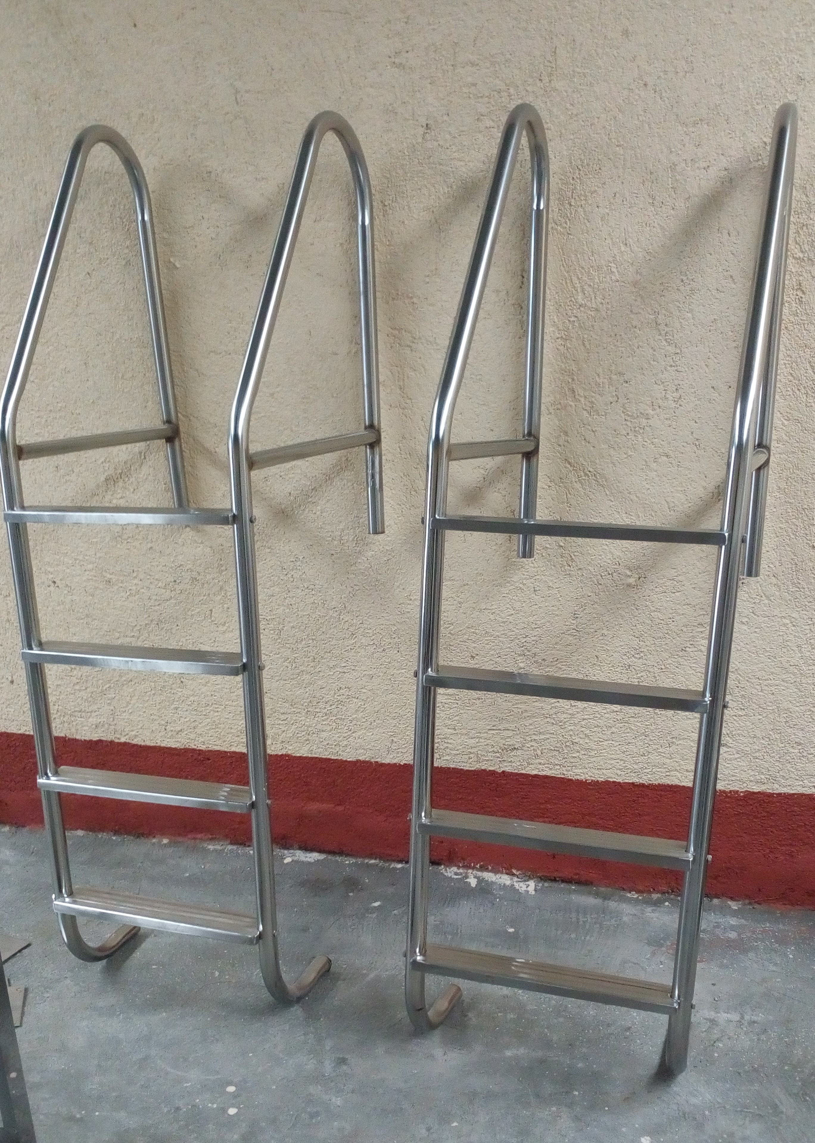 Highly durable non-staining stainless swimming pool ladders (3-step, 4-step..etc). Custom designed swimming pool railings complete with stainless steel hooks and support brackets.